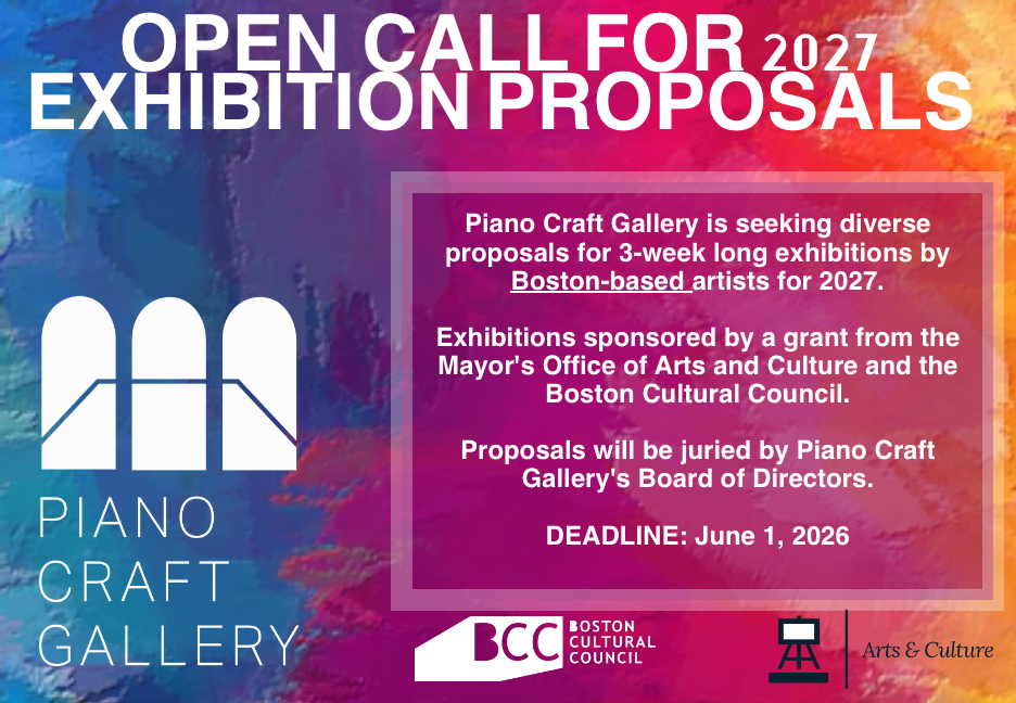 Piano Craft Gallery is proud to announce it’s call for proposals for 2027 exhibitions. We are excited to receive proposals from Boston-based artists, groups, collectives, and curators that represent the diversity of art-making in the city. Artists should be encouraged to visit Piano Craft Gallery and to review our floor plan before submitting a proposal. Submission is free, but donations and Gala ticket sales are greatly appreciated. Please email egrau@pianocraftgallery.com with any questions.