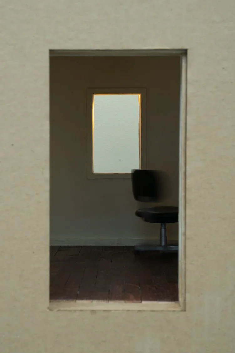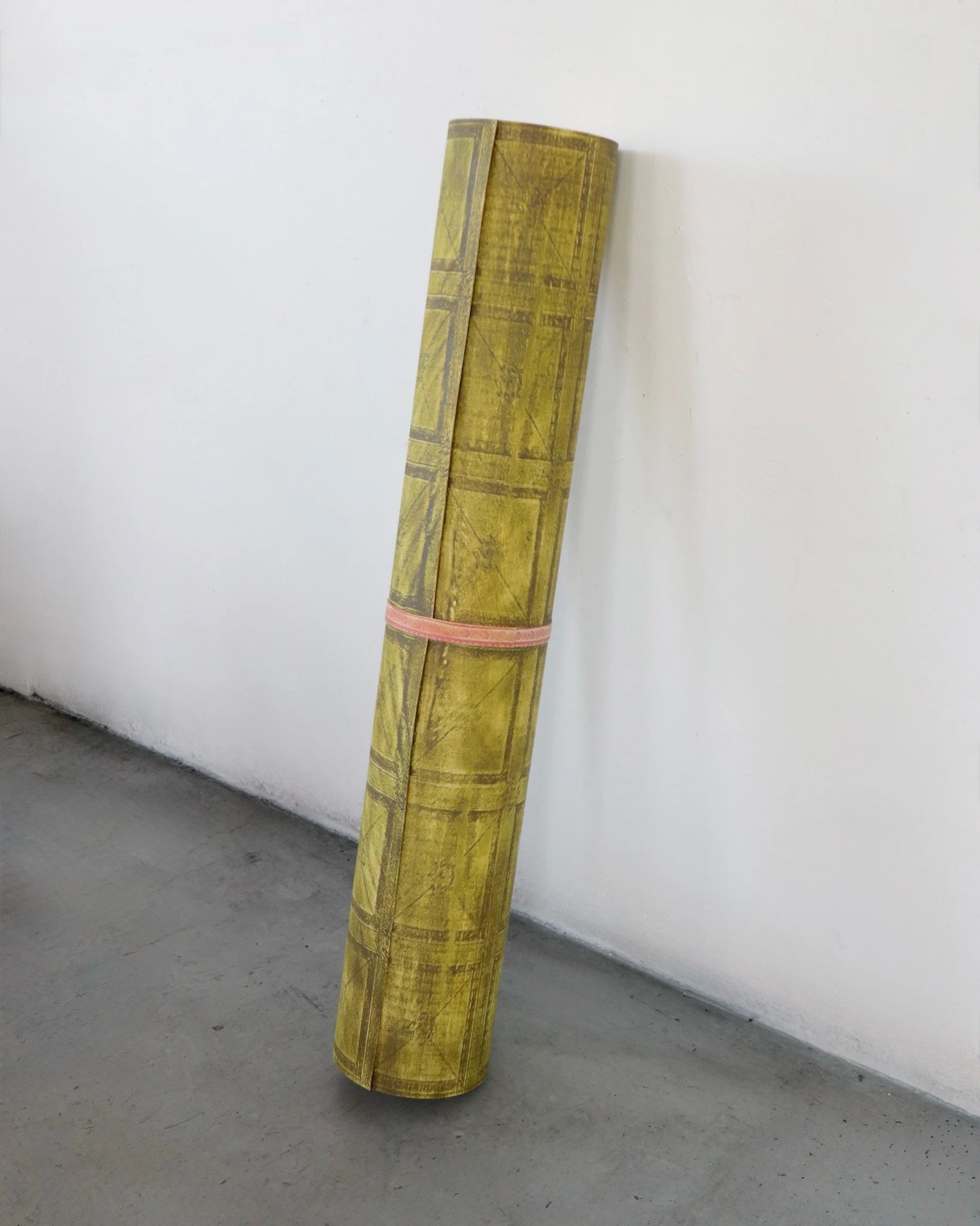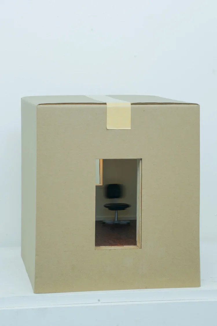 Objects, sculptures, installations, and paintings occupy, hide beneath, and balance atop the boxes, guiding viewers through the space as they wait to be discovered. Caba’s paintings freeze moments in time: a carpet laid bare, waiting to be packed away; others slowly unrolling themselves; shirts stacked together, uncertain of when they will dress a body again.