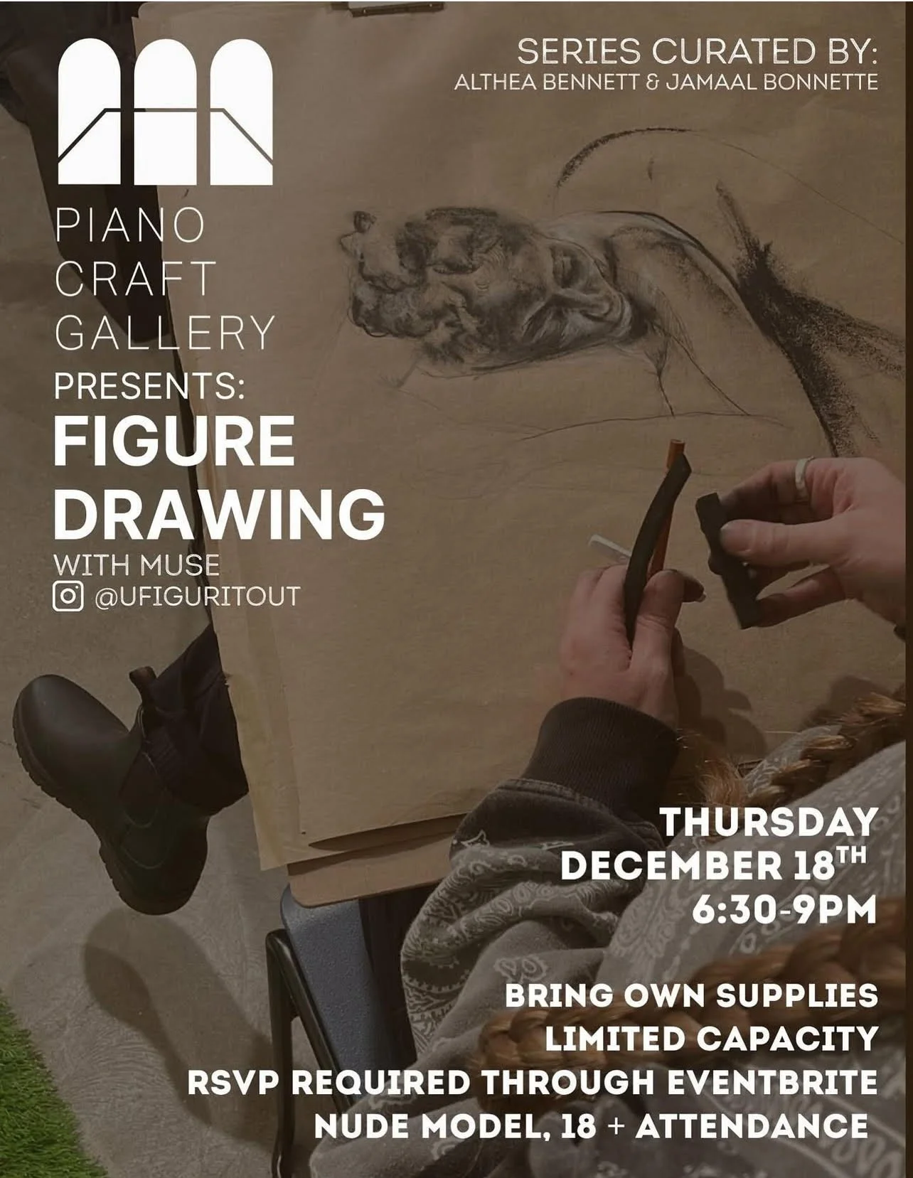Live Figure Drawing is back at The Piano Craft Gallery! Develop your figure drawing skills with artists and directors Althea B Bennet & Jamaal Bonnette! Participants will practice figure drawing with a live model through gesture sketches and longer-duration observation. This in-person event is perfect for artists of all levels looking to practice their drawing skills. Grab your sketchbook and pencils and get ready to capture the beauty of the human form. Whether you're a seasoned artist or just starting out, this event is a great opportunity to hone your craft. All skill levels are welcome. Participants are asked to provide their own media supplies.