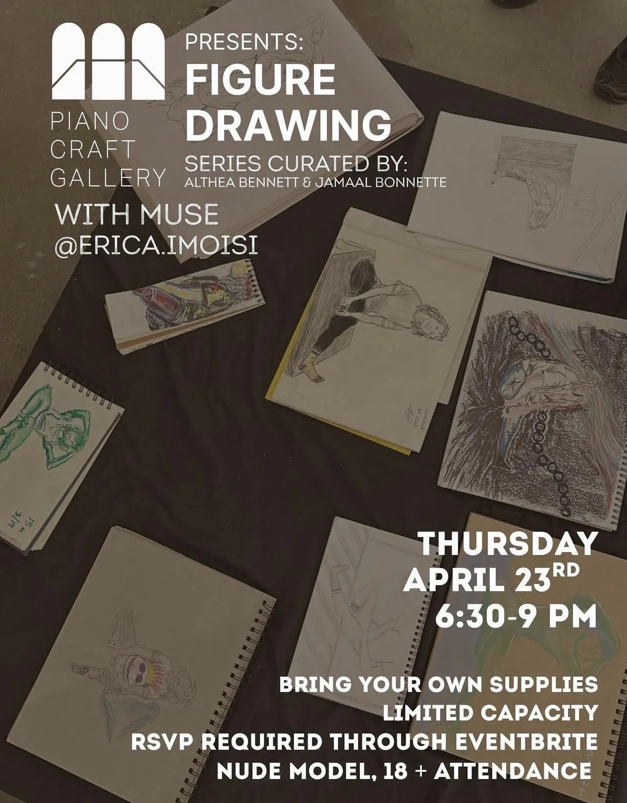 Live Figure Drawing is back at The Piano Craft Gallery! Develop your figure drawing skills with artists and directors Althea B Bennet & Jamaal Bonnette! Participants will practice figure drawing with a live model through gesture sketches and longer-duration observation. This in-person event is perfect for artists of all levels looking to practice their drawing skills. Grab your sketchbook and pencils and get ready to capture the beauty of the human form. Whether you're a seasoned artist or just starting out, this event is a great opportunity to hone your craft. All skill levels are welcome. Participants are asked to provide their own media supplies.