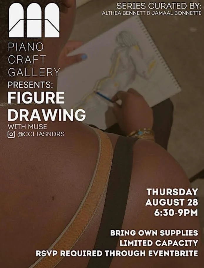 Live Figure Drawing is back at The Piano Craft Gallery! Develop your figure drawing skills with artists and directors Althea B Bennet & Jamaal Bonnette! Participants will practice figure drawing with a live model through gesture sketches and longer-duration observation. This in-person event is perfect for artists of all levels looking to practice their drawing skills. Grab your sketchbook and pencils and get ready to capture the beauty of the human form. Whether you're a seasoned artist or just starting out, this event is a great opportunity to hone your craft. All skill levels are welcome. Participants are asked to provide their own media supplies.